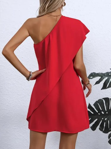 • Kadın tek omuzu açık önü asimetrik kesim detaylı sandy elbise