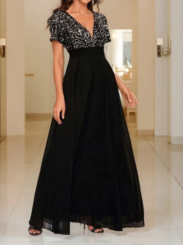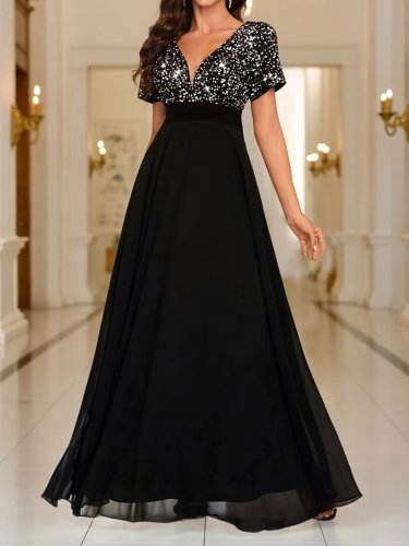 • Kadın kısa kollu derin v yakalı a kesim pulpayet detaylı şifon nedime elbisesi