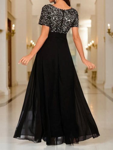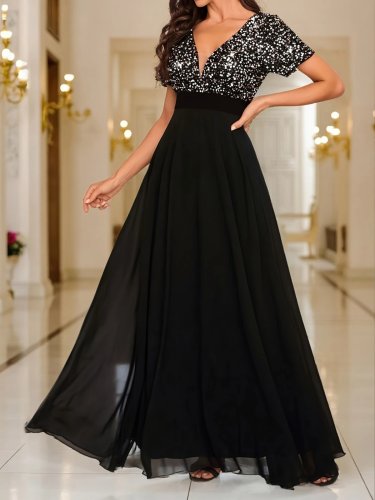 Kadın kısa kollu derin v yakalı a kesim pulpayet detaylı şifon nedime elbisesi
