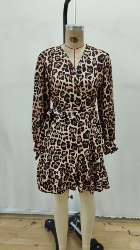 • Kadın uzun kollu kruvaze yakalı fırfırlı belden kuşaklı leopar desen modal elbise